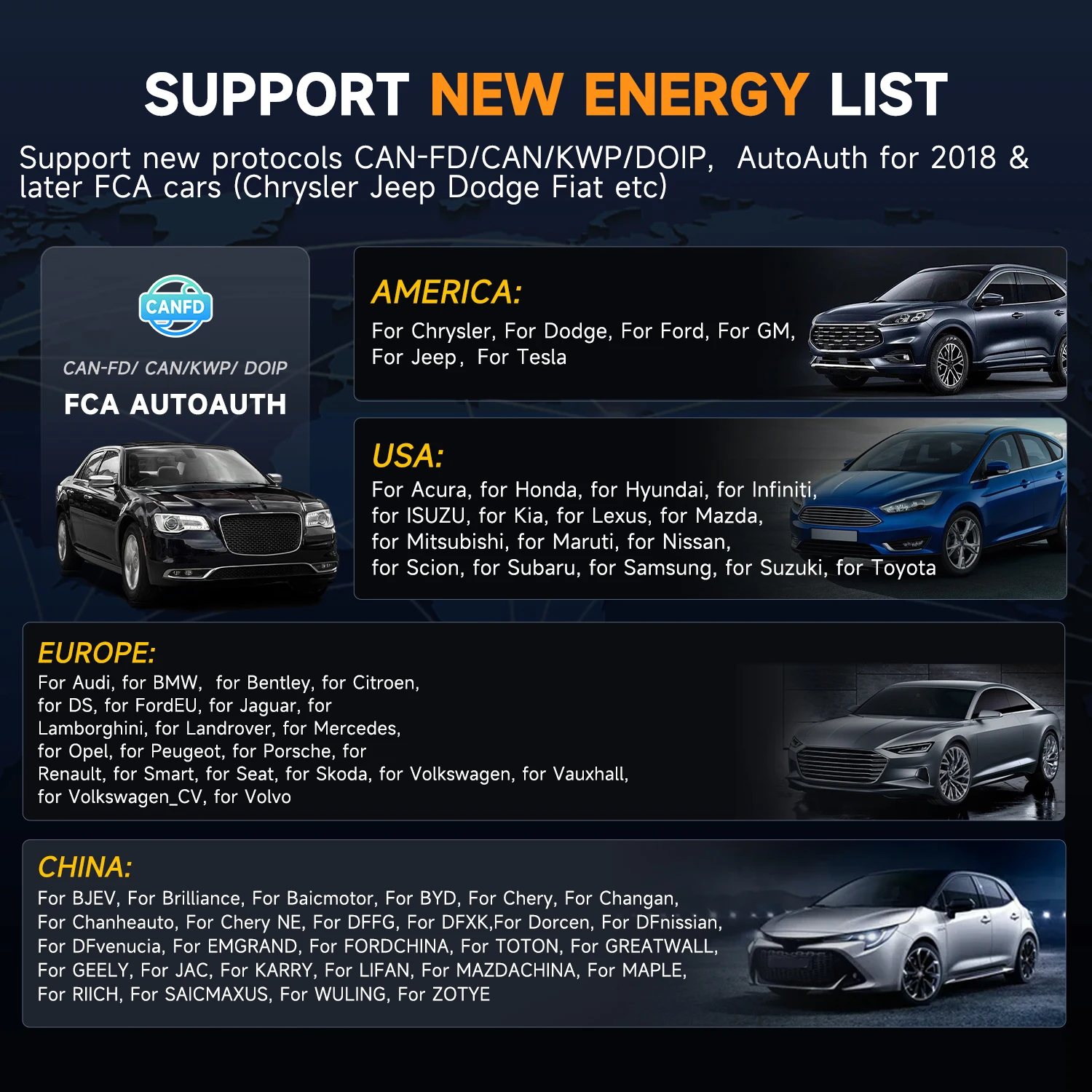 Para Chrysler, para Ford, para GM, para GM Brasil, para Fiat Brasil (incluindo fabricante de automóveis brasileiro).Para JEEP, para TESLA, para DODGE, para BUICK, para