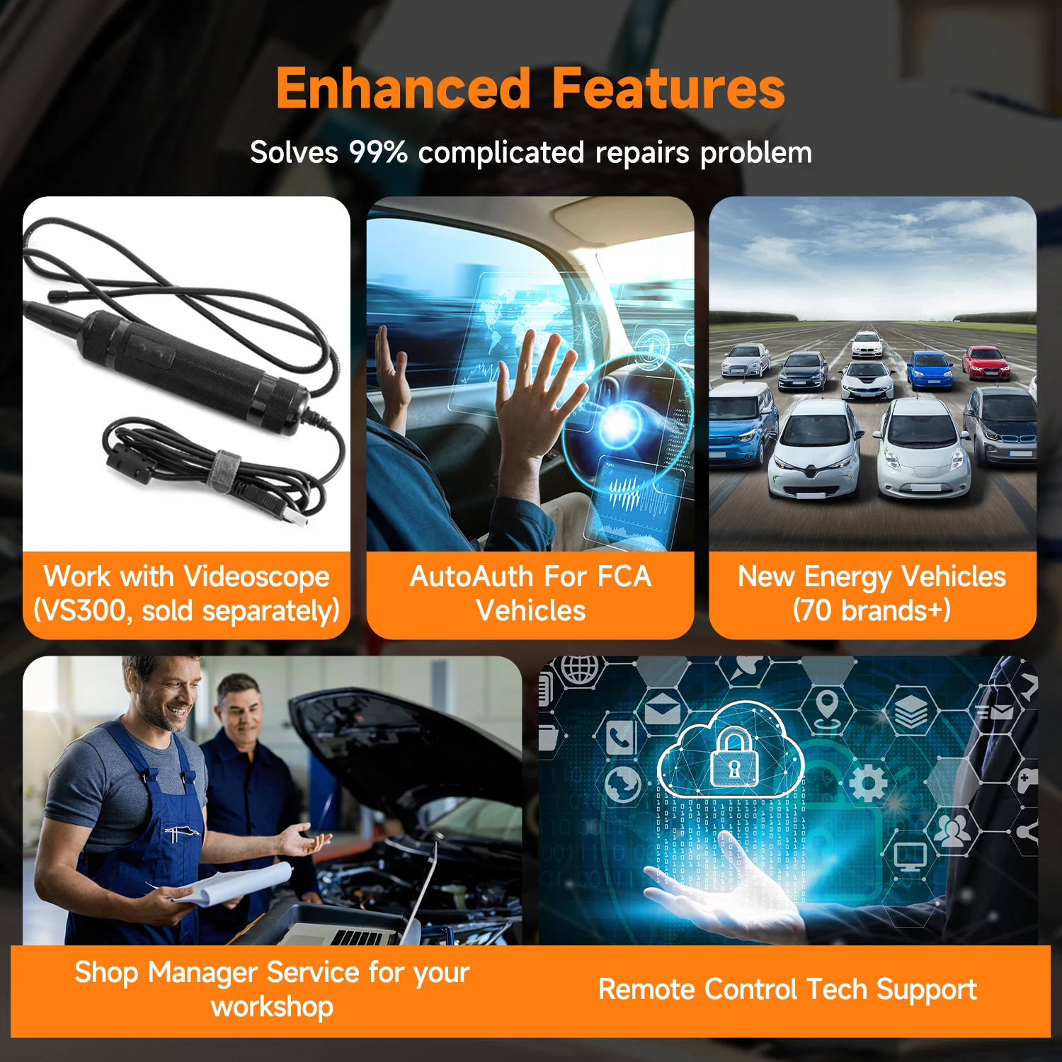 1Os procedimentos guiados passo a passo para veículos VW/Audi incluem etapas de desmontagem, especificações de torque e análise de falhas - ajudando você a competir com concessionárias (os custos do serviço de concessionária são 30% mais altos) 2Suporte FCA SGW para desbloquear dados extras para sistemas-chave como motor e transmissão - economizando mais de US $ 200 (Nota: o acesso SGW requer um cabo adaptador extra, não incluído.)