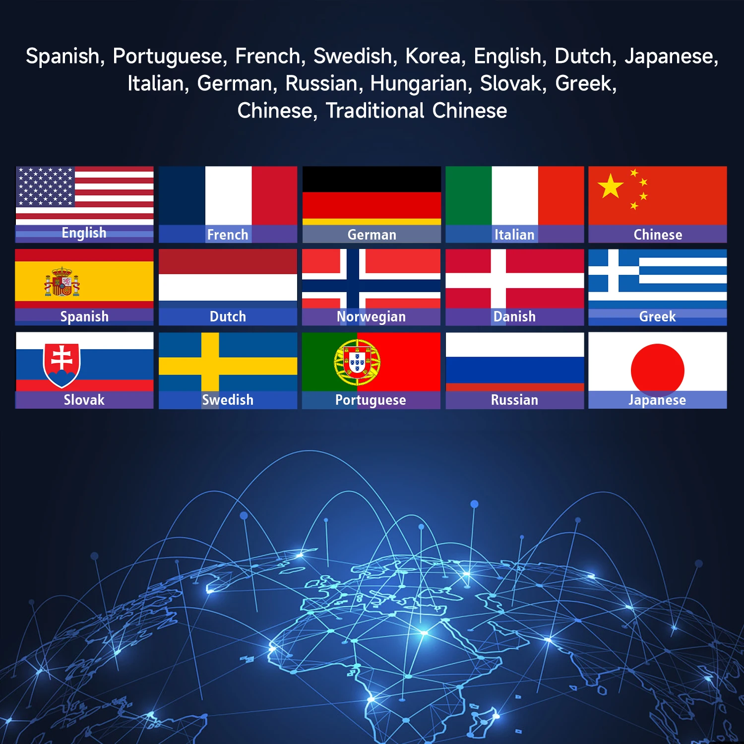 Coreia, espanhol, português, francês, sueco, inglês, holandês, japonês, italiano, alemão, russo, húngaro, eslovaco, grego, chinês, chinês tradicional