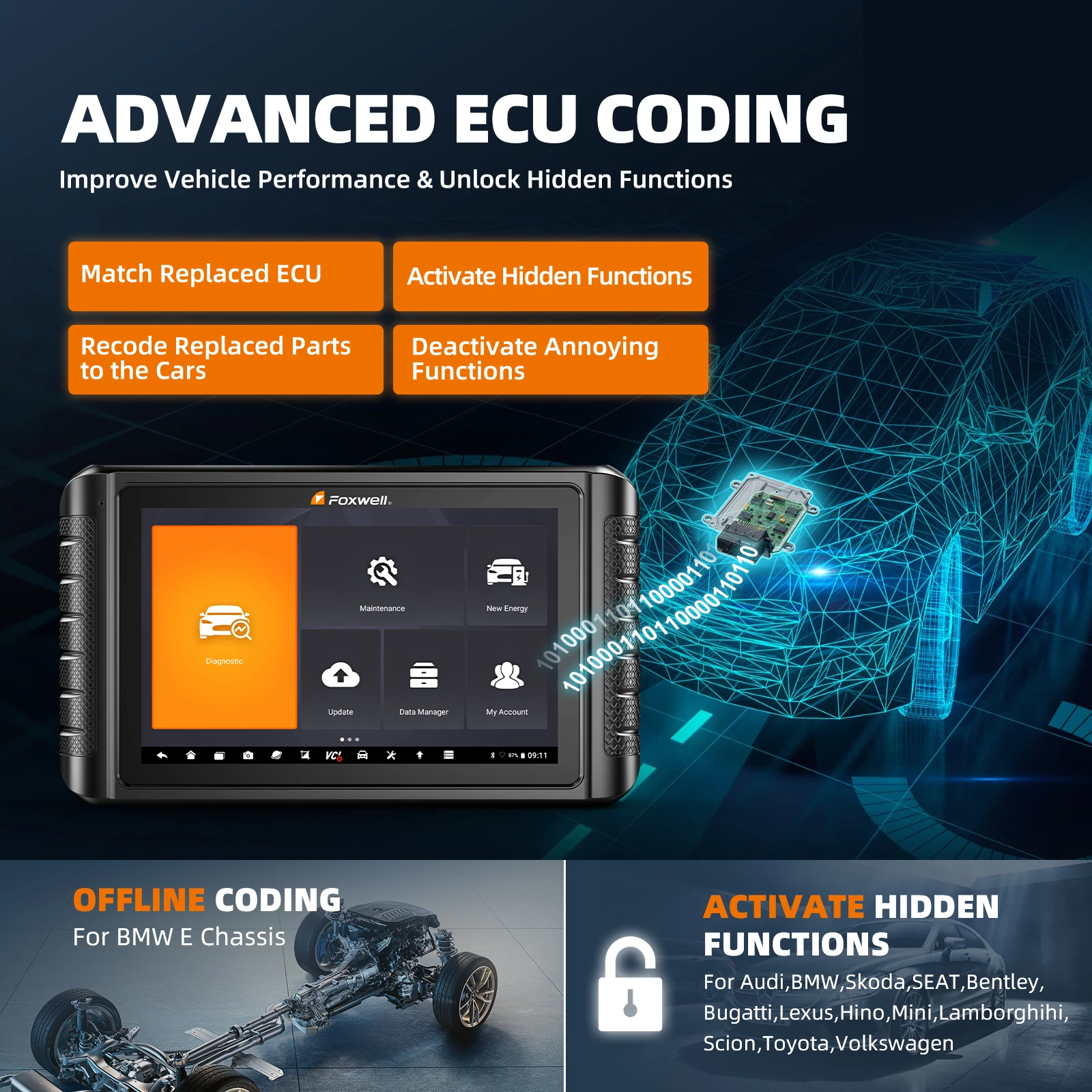 Você também pode fazer ajustes manuais para quebrar as limitações e restrições das configurações específicas do mercado do carro quando ele saiu da fábrica.Com a ajuda da codificação on-line desta ferramenta de verificação, você pode desabilitar funções irritantes ou ativar recursos de última geração, fazer modificações de software para alterar como ela se comporta originalmente.Aqui estão alguns exemplos: